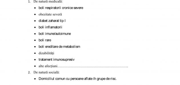(3) Preșcolarii/Elevii care locuiesc împreună cu o persoană diagnosticată cu afecțiuni asociate cu imunodepresie moderată sau severă (transplant, afecțiuni oncologice în tratament imunosupresor, imunodeficiențe primare sau dobândite, alte tipuri de tratamente imunosupresoare) pot fi scutiți de prezența fizică în școală, chiar dacă sunt vaccinați cu schema completă.