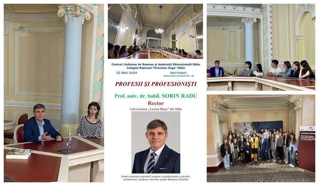 Îi mulțumim domnului Rector Prof. univ. dr. habil. SORIN RADU pentru implicarea domniei sale în strădania elevilor de a înțelege cât mai bine specificul și cerințele profesiilor din domeniul istoriei, carierei universitare și diplomației, pentru informațiile și sfaturile valoroase oferite elevilor astfel încât aceștia să ia cea mai bună decizie privind traseul lor de carieră. Proiectul PROFESII ŞI PROFESIONIŞTI, dedicat orientării şcolare şi profesionale a elevilor Colegiului Naţional “Octavian Goga” Sibiu, este inițiat și coordonat de Simona Crăciun – profesor consilier școlar C.J.R.A.E. Sibiu și a ajuns anul acesta la ediția a VIII-a.