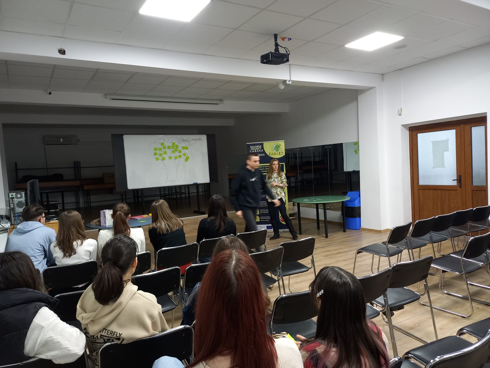 C.A.R.E.E.R – Adaptability to the labouR markEts with local, national and Eu background pe doamna consilier de carieră Vanina Szoke de la Centrul de Servicii Integrate SmartHUB din cadrul Universităţii Lucian Blaga din Sibiu, care a organizat împreună cu elevii din echipa de proiect – elevi de clasele a XI-a şi a XII-a la Colegiul Naţional “Octavian Goga”, un workshop cu tema Managementul Carierei.