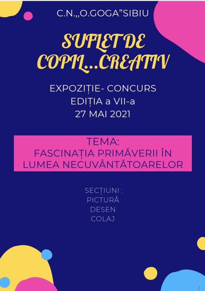READ MOREColegiul Naţional ,,Octavian Goga” Sibiu organizează, în data de 27 mai 2021, Expoziţia- Concurs de creaţie artistică ,,Suflet de copil… creativ”. Scop: – stimularea şi afirmarea potenţialului artistic şi plastic al copiilor din învăţământul primar Obiective: cunoaşterea şi utilizarea unor tehnici de lucru diverse; promovarea lucrărilor participanţilor prin realizarea unei expoziţii; realizarea unui cadru activ, […]
